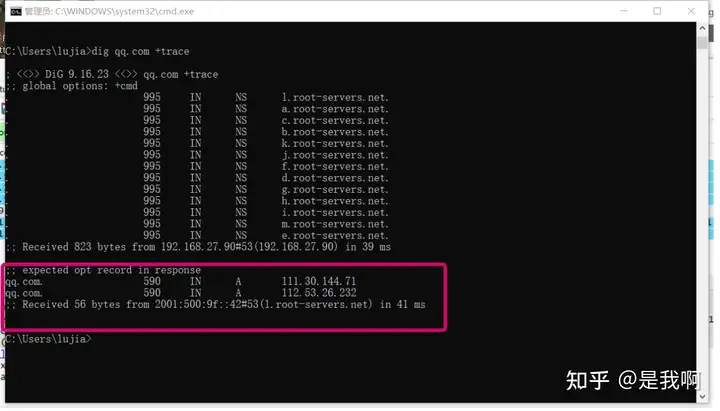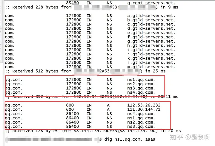 正常用户递归Trace结果应该会展现各级NS记录,而非根服务器直接抢先应答用户http://qq.com的A记录结果,出现这种情况大概率是被劫持了(有可能被某些流氓软件-xx浏览器劫持了DNS)。