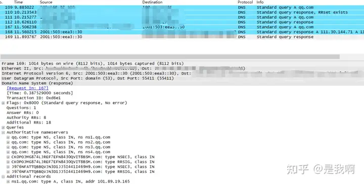 3.用户再次给本地DNS发起解析请求,此时DNS本地程序向本机配置的LocalDNS发起解析请求(部分用户是自定义配置的DNS业务地址,另外部分用户默认使用由ISP省网侧BRAS自动下发给ONT(光网络终端,即光猫)的LocalDNS地址),LocalDNS(可以理解为位于ISP内部的DNS缓存服务器)首先查看是否存在缓存记录,若有则直接返回缓存记录,若无则交给递归服务器进行逐级递归,最终抓包过程中会先反馈用户一个A记录解析包,然后再回复一个请求http://qq.com递归过程中的逐级NS(名称服务器,即授权服务器)的解析记录。